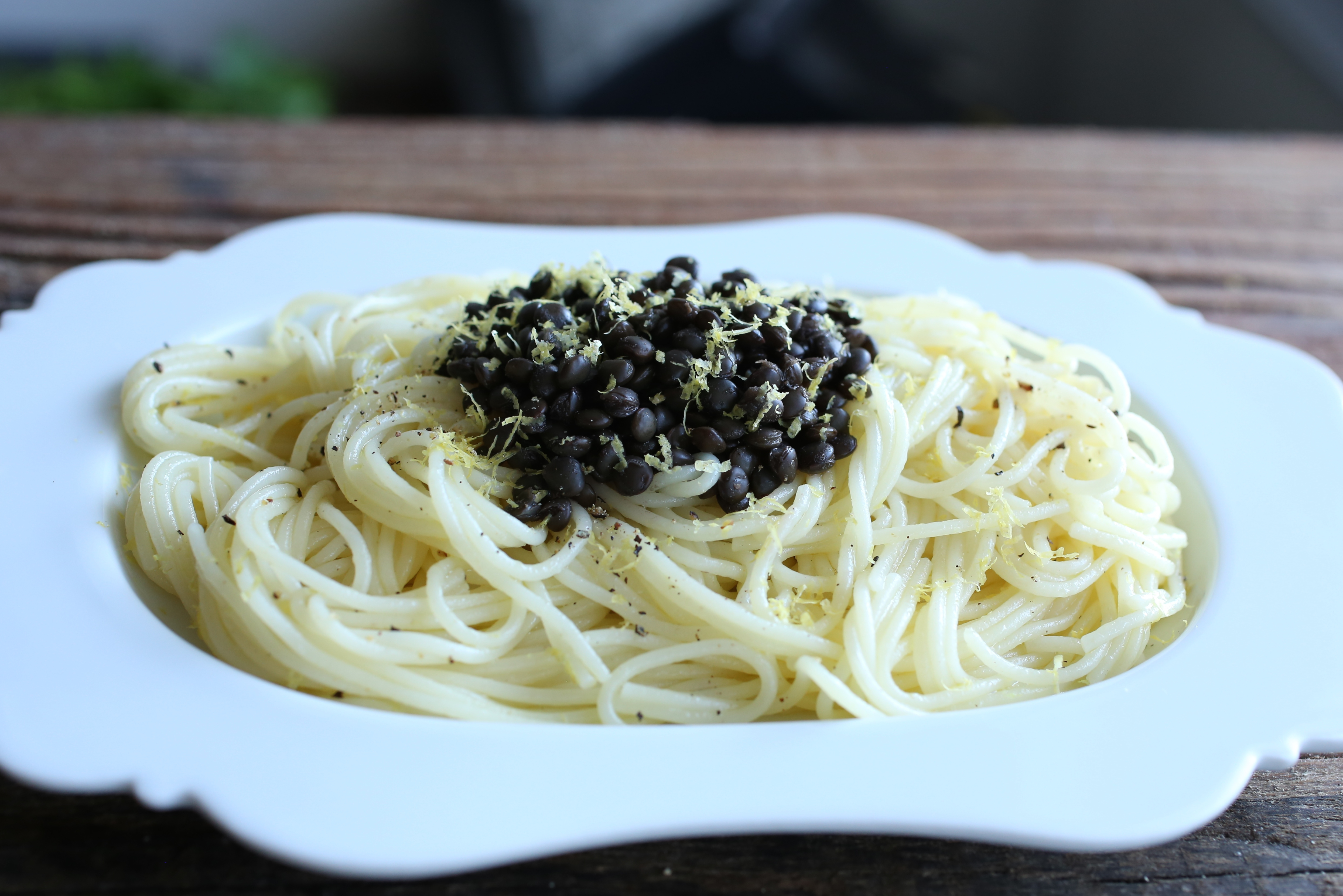 Place one serving of pasta on each plate and top with a large dollop of black lentils. Garnish with grated lemon zest. Serve immediately.