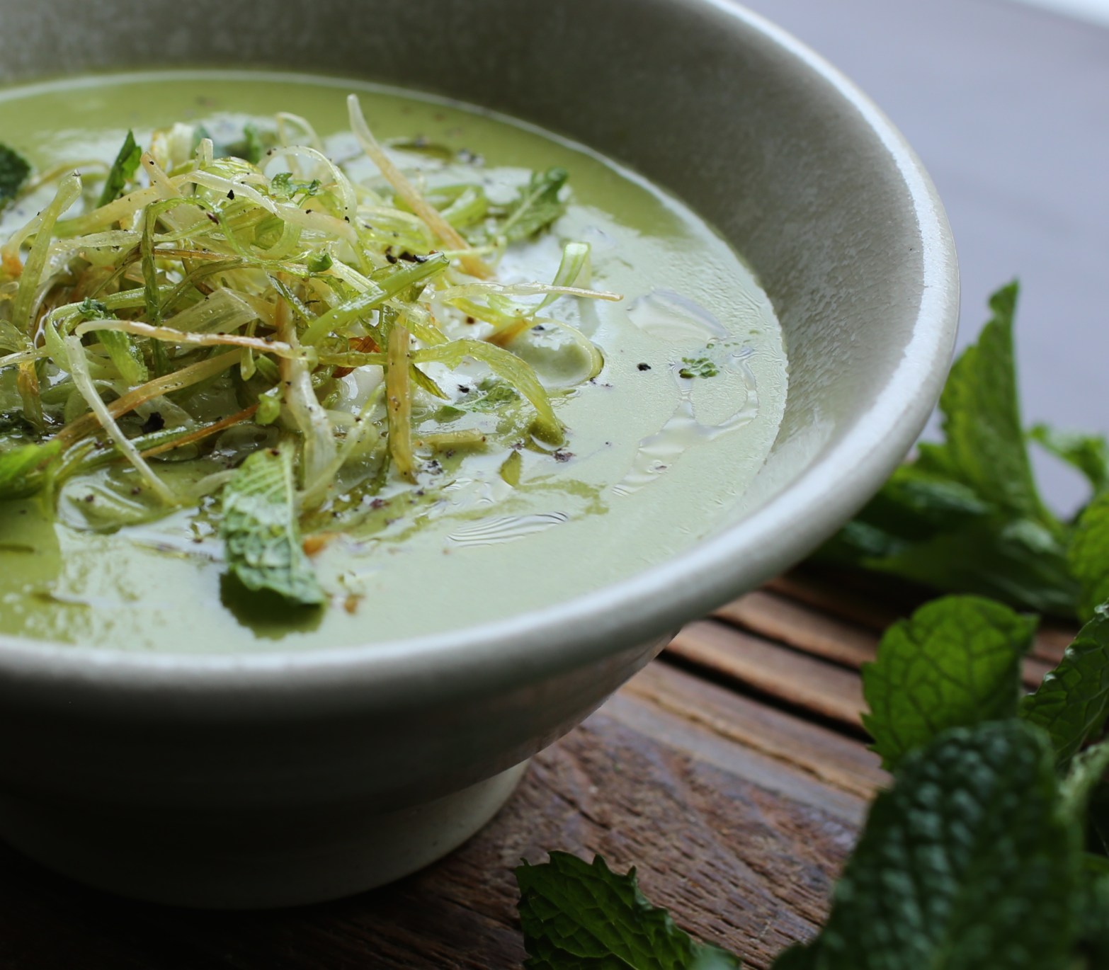 To serve, ladle soup in bowls, drizzle with olive oil and a dollop of cream, if using. Garnish with mint leaves and frizzled leeks. Sprinkle with black pepper.