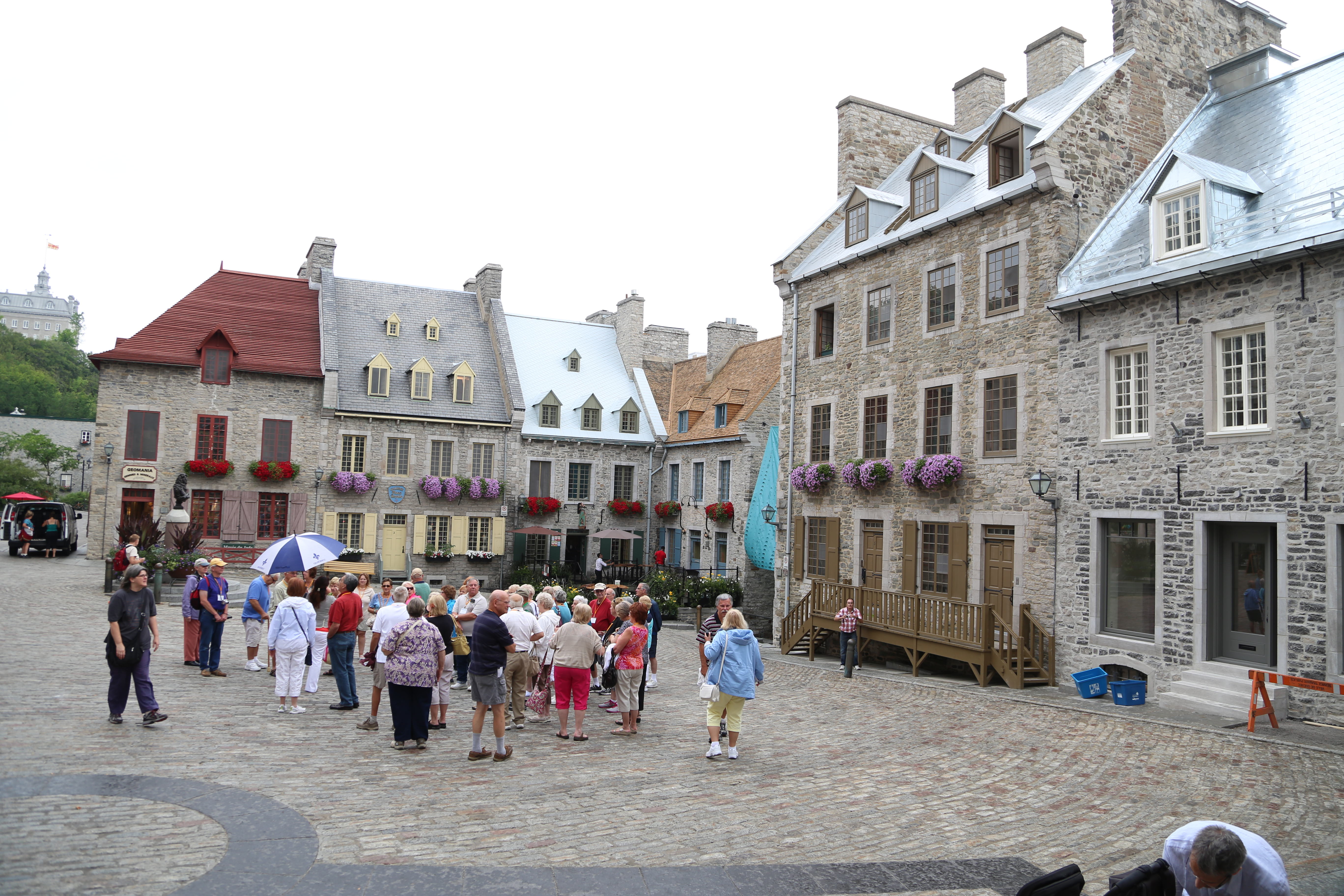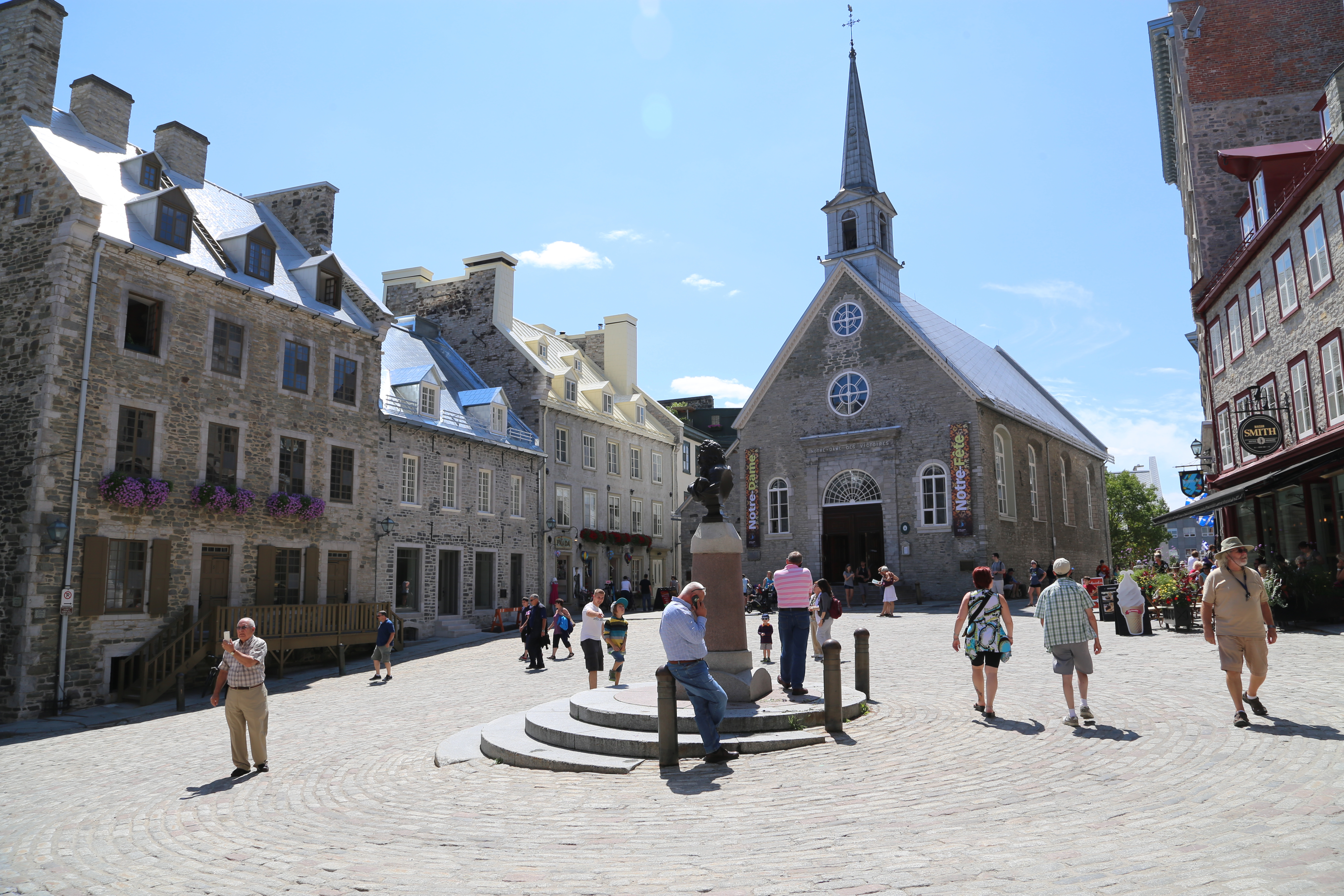 The historical heart of the Old City is Place Royale. It’s not only the birthplace of French civilization in North America, but also one of the continent’s oldest settlements. Dominating the plaza is the oldest church in Québec, Notre Dame Des Victoires. If you take a peek inside you’ll see a small boat suspended from the ceiling. Information about the replica is inside the church. In Place Royale you can also see an immense tromp-l’oeil mural of people—historic figures, and nearly a dozen of Québec’s leading artists and writers—from the early city.