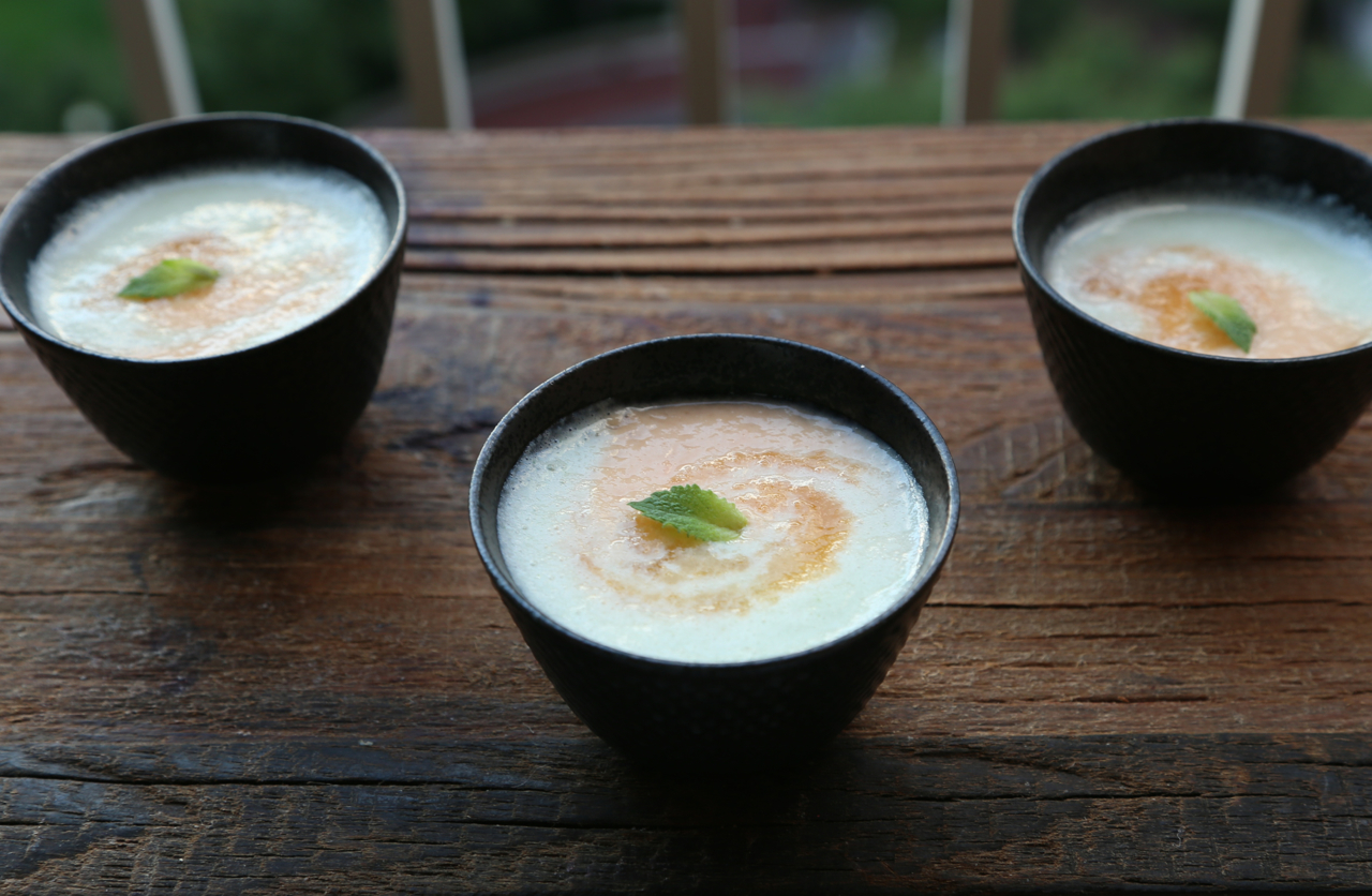 Rinse blender or processor and repeat the same process with the honeydew: purée honeydew with tofu, add mint, Tamari sauce, and a tiny pinch of salt and pepper. Pour into another container and refrigerate honeydew mixture for at least one hour.