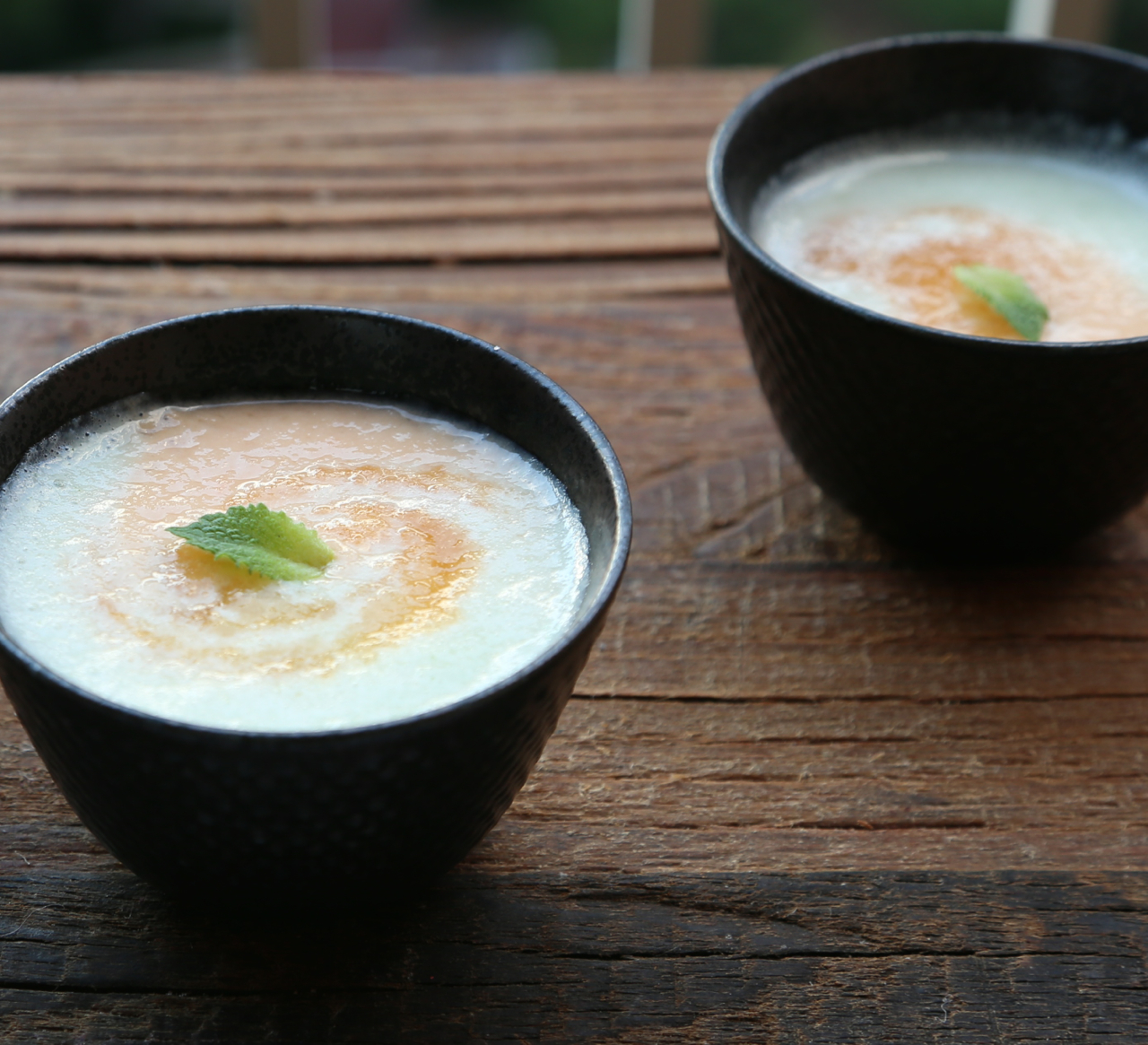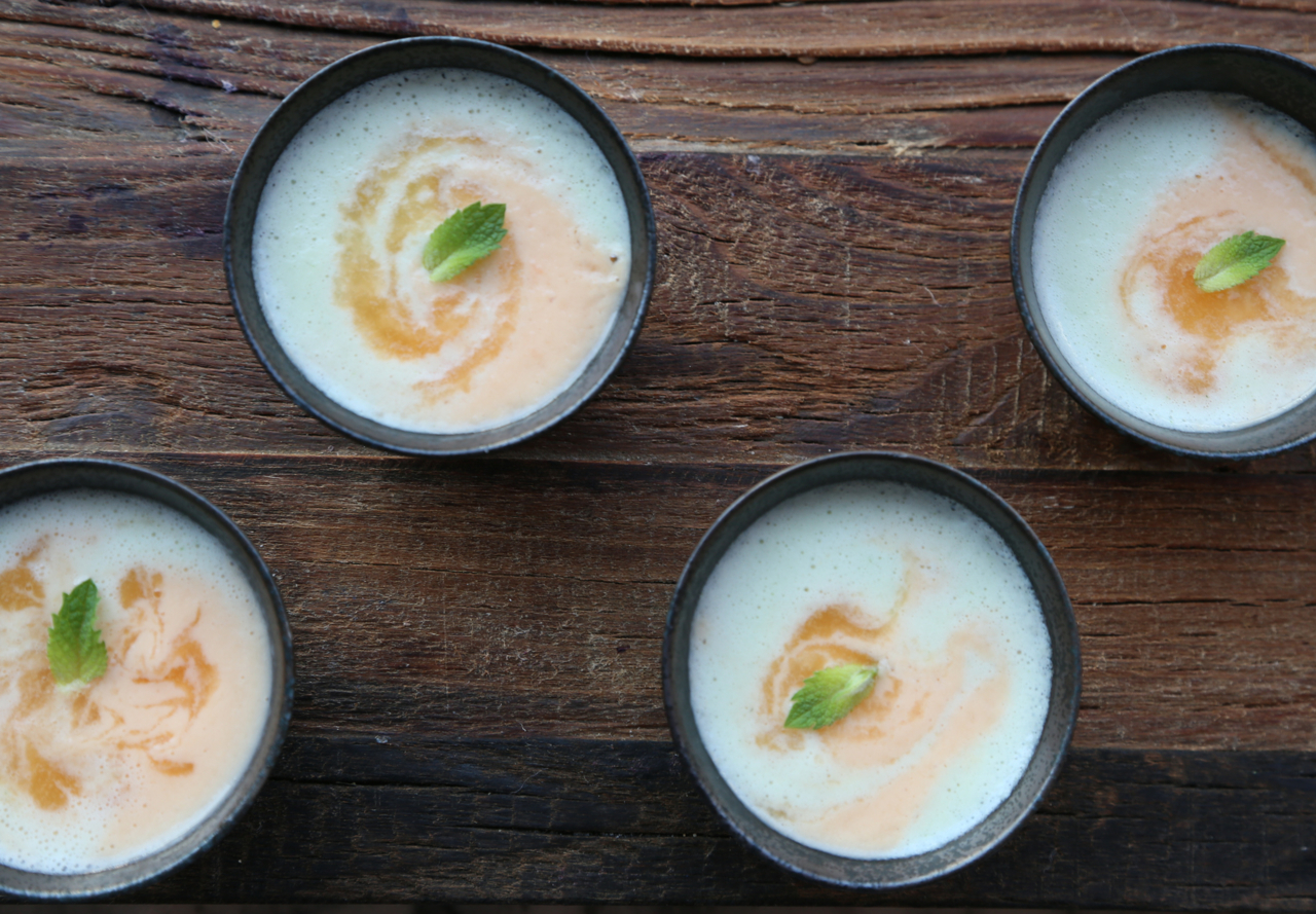 To serve, carefully pour the two purées of the melons simultaneously in individual bowls. Use a knife, to delicately create a motif and garnish with mint or melons if you’d like. Enjoy!