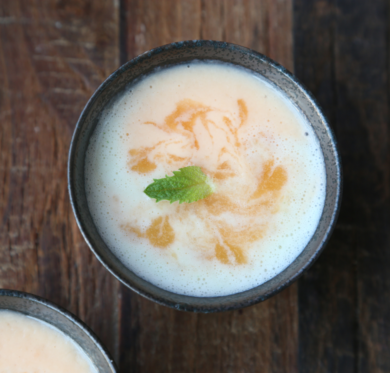For garnish and added contrast, I puréed an extra 1/4 cup or so of just cantaloupe and swirled it in the mixed soup with a knife. This was done purely for aesthetics and is not necessary for the recipe.