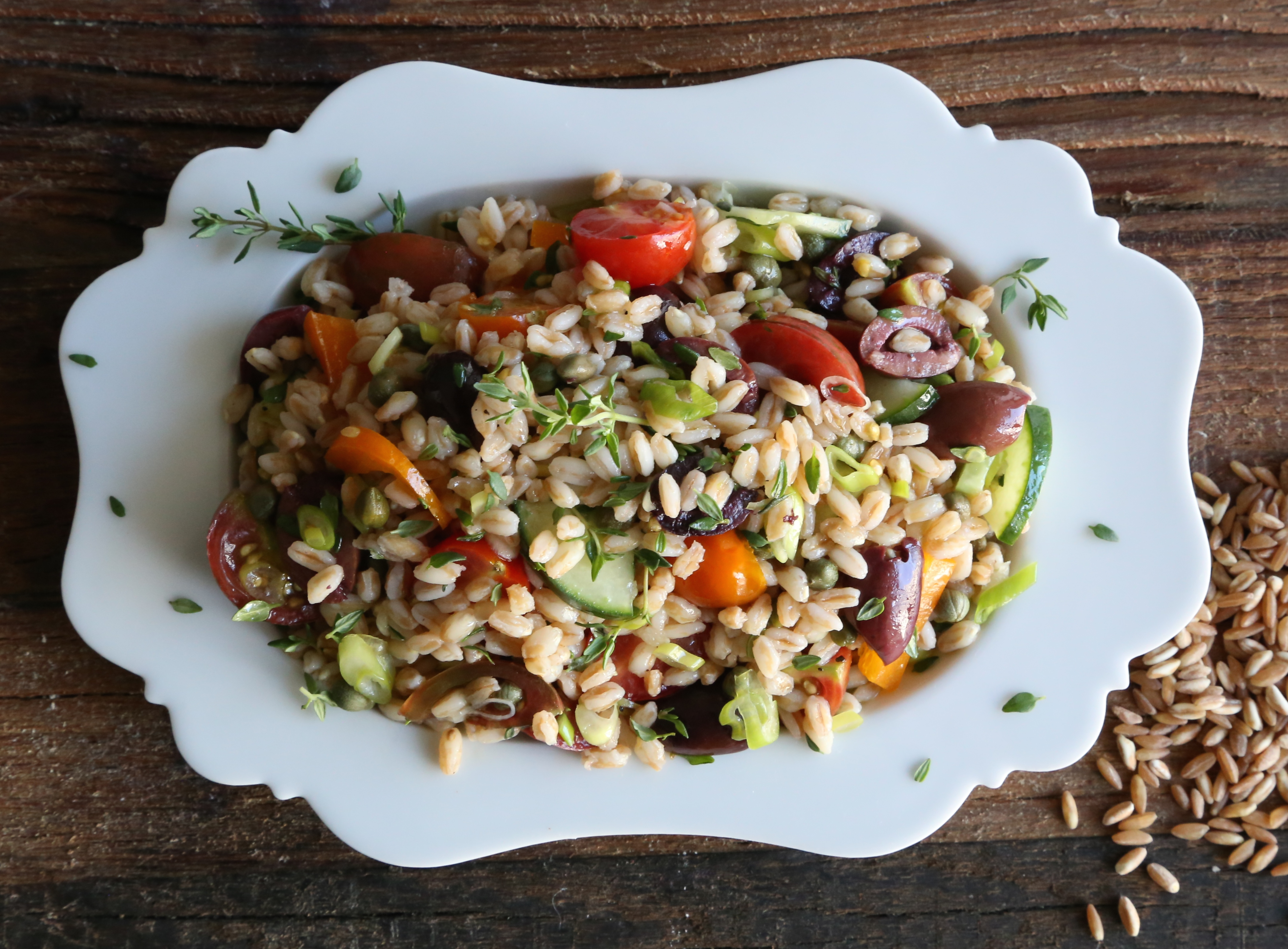 In a large bowl, combine cooked and cooled farro, olives, capers, thyme leaves, tomatoes, green onions, cucumber and bell pepper. Add the dressing and gently mix everything together. Taste, adjust seasoning and serve.