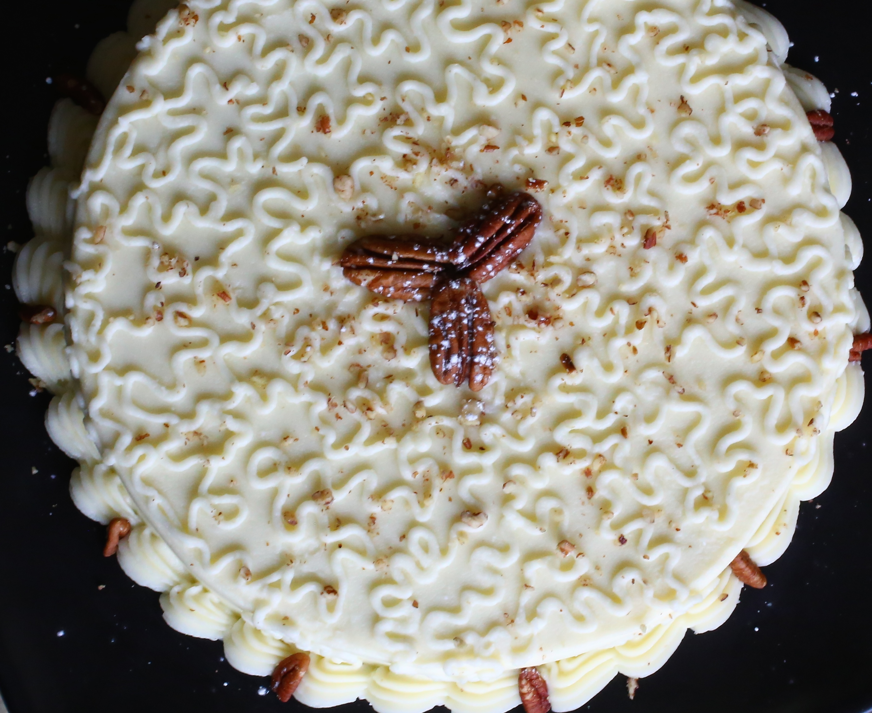 When the cakes are totally cool, place one layer on a serving dish. Spread a layer of frosting on top and in between layers if making multiple layers. Garnish with chopped pecans and sprinkle lightly with powdered sugar. Serve and enjoy!