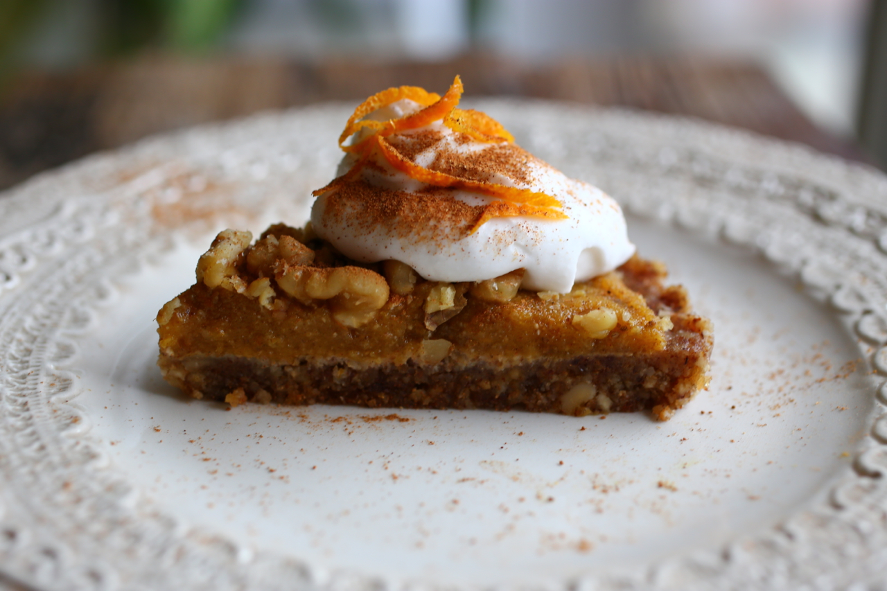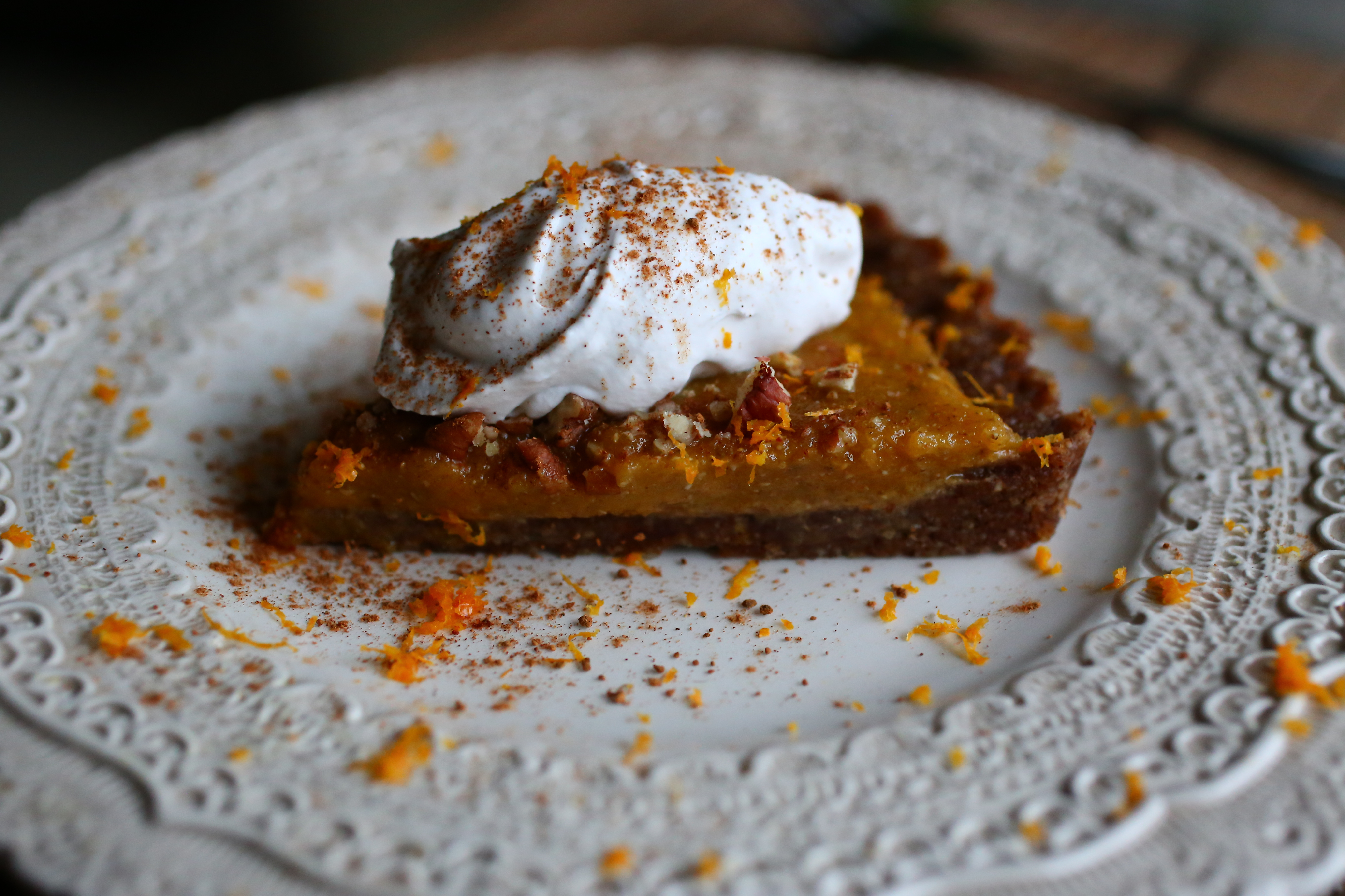 Remove the tart shell from the refrigerator. Spread the pumpkin filling into the crust. Spread evenly using a small spatula. Garnish with nuts, if using, coconut whipped cream and sprinkle with pumpkin pie spice and orange zest.