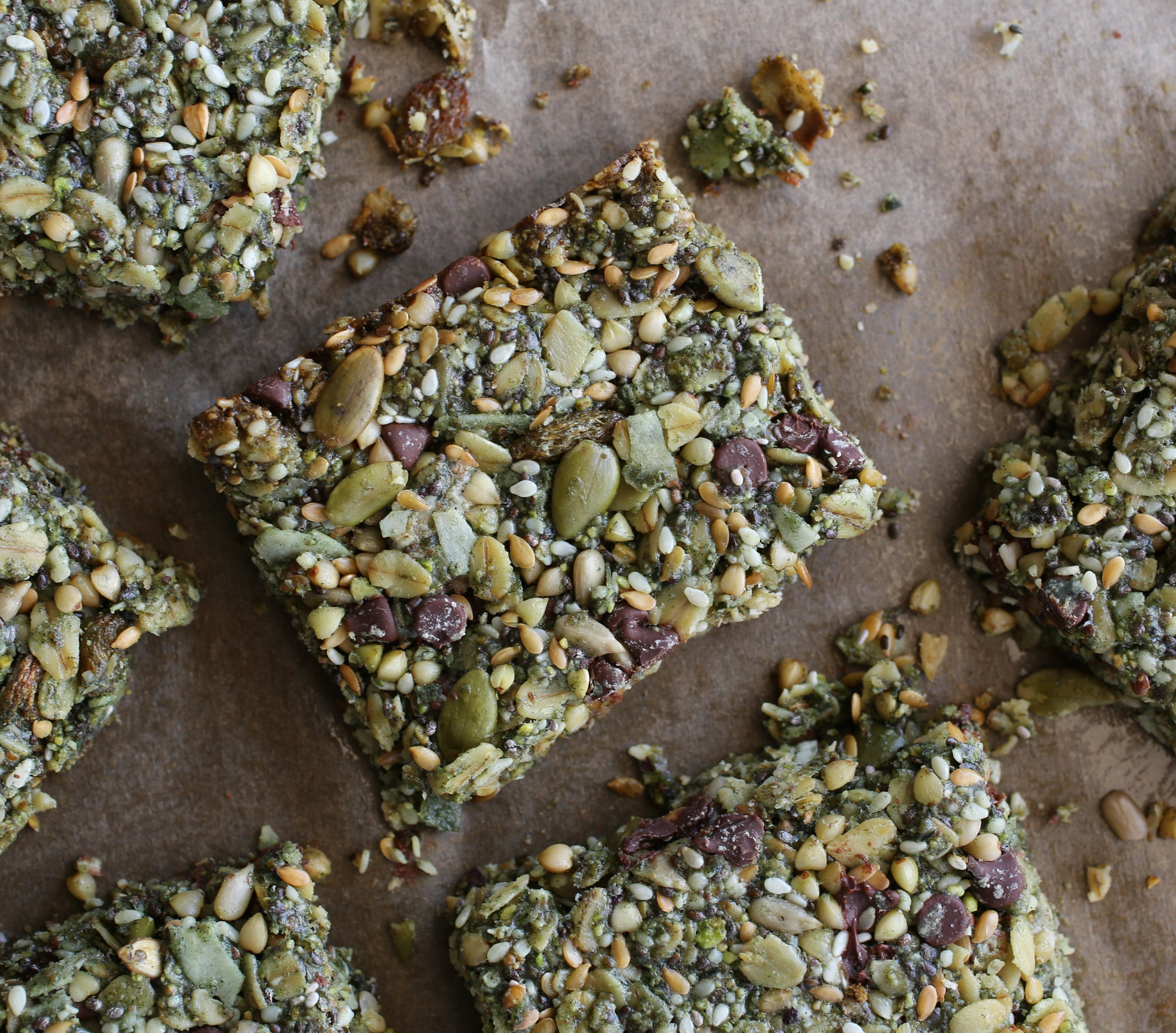 These Green-ola bars are sweetened with coconut sugar, honey and chocolate chips, and also flavored with coconut oil and almond butter. Not only are they full of flavor, but they’re also quite healthy for you. Besides spirulina, they’re loaded with an array of other powerful plant foods (superfoods) like pumpkin, sesame, flax, sunflower, hemp and chia seeds.