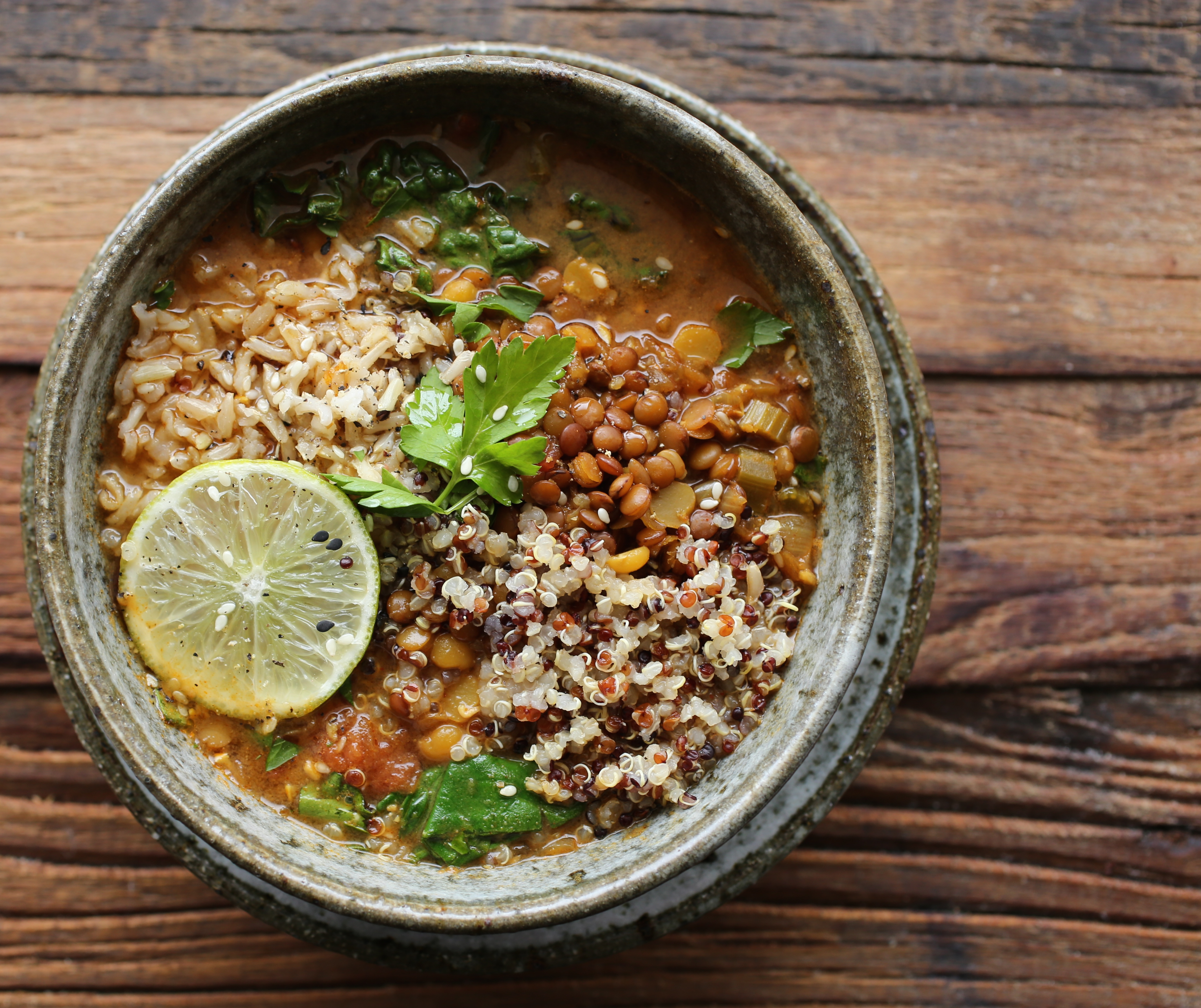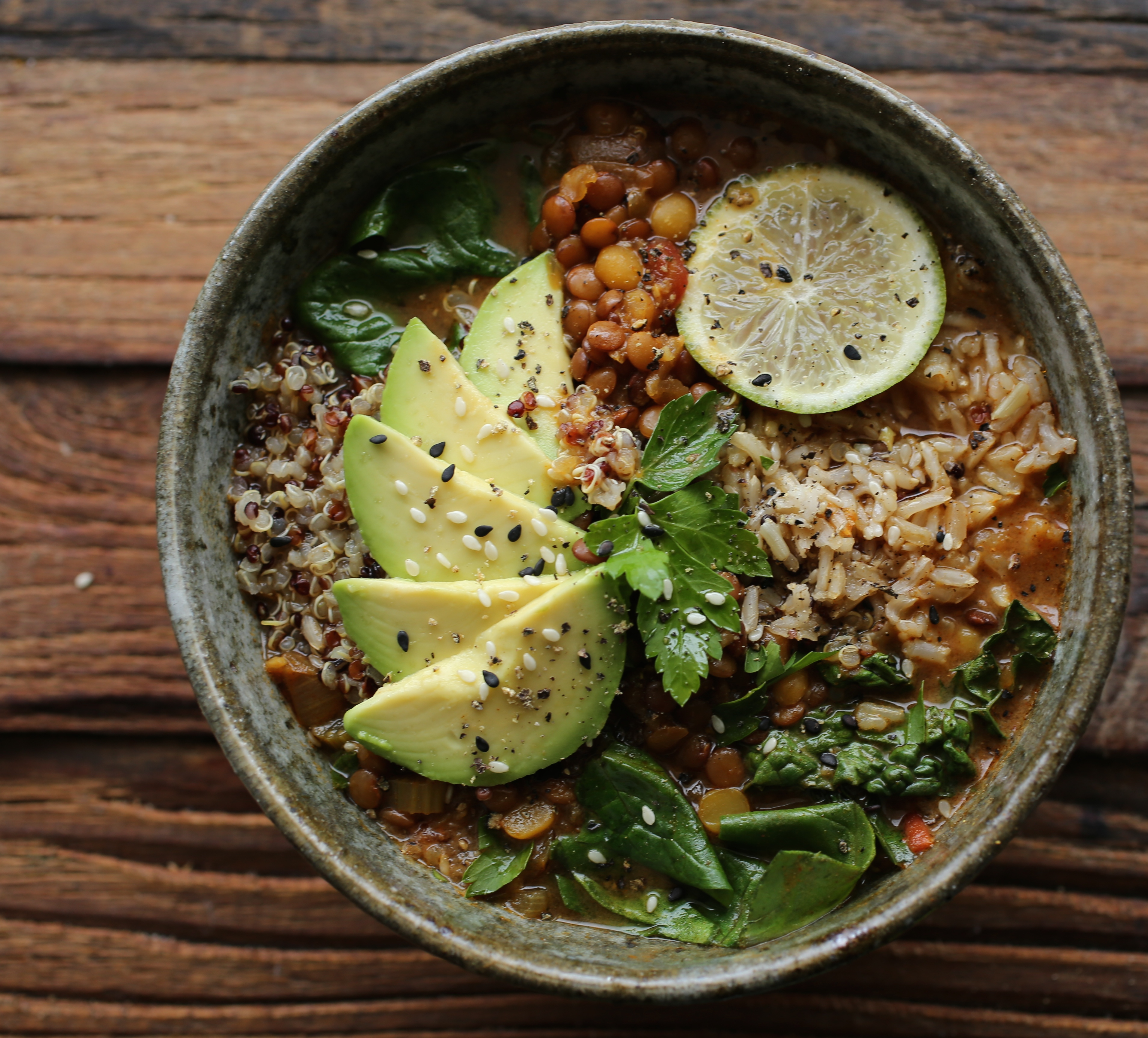 Ladle in bowls over brown rice and quinoa. Serve with a splash of lime, a squeeze of fresh lime juice, and avocado slices. Garnish with sesame seeds and fresh cilantro. Drizzle with a little sesame oil, if you like. Sprinkle with black pepper.