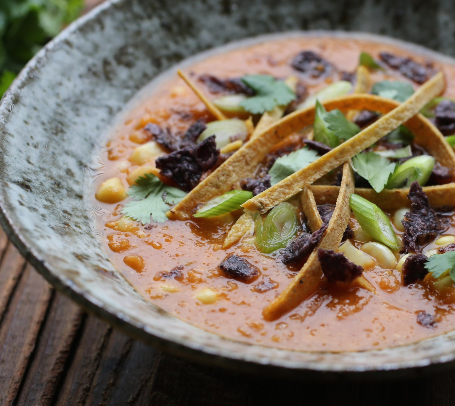 * for baked tortilla garnish, preheat oven to 350F. Cut tortilla into small strips. Place on a parchment lined baking pan and bake until crispy, about 5-7 minutes.