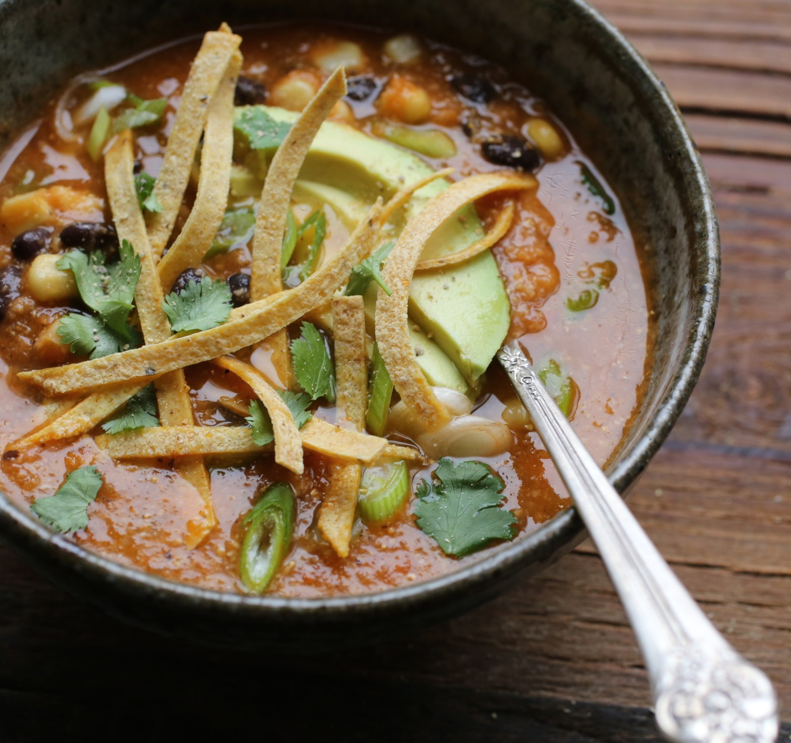 Remove from heat. Using an immersion blender or high speed blender, blend soup into the consistency of a coarse purée. Return soup to the pot and add the black beans, if using, and reserved corn kernels. Bring the soup to a low boil again. If you like, you can adjust the consistency, adding more water or broth if you find it too thick. Taste and adjust for salt. Serve and garnish with tortilla chips, scallions, cilantro and/or avocados. Sprinkle with freshly ground white pepper and serve with a splash of fresh lime juice! So yummy!