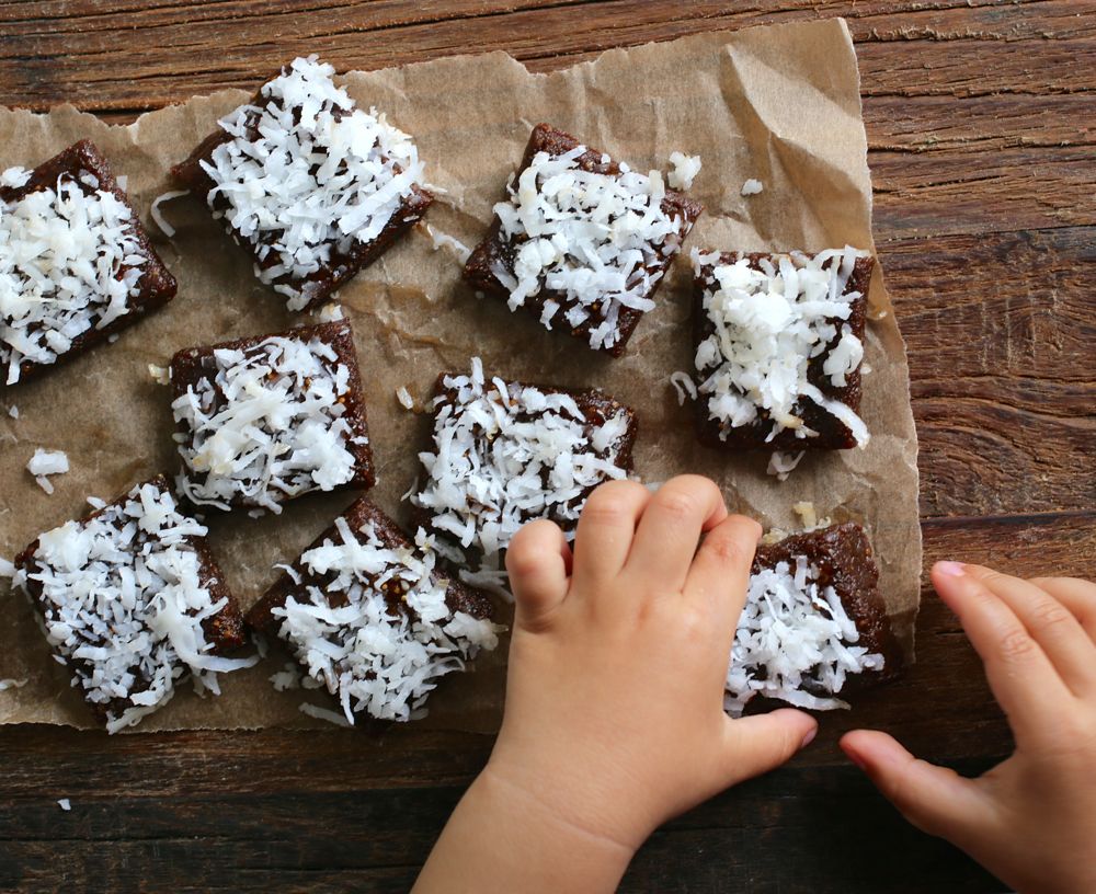 If using spread or jam, add a small smear onto each bar. Add shredded coconut to a small plate. Press both sides of the squares into the coconut to coat. Refrigerate for about an hour prior to serving.