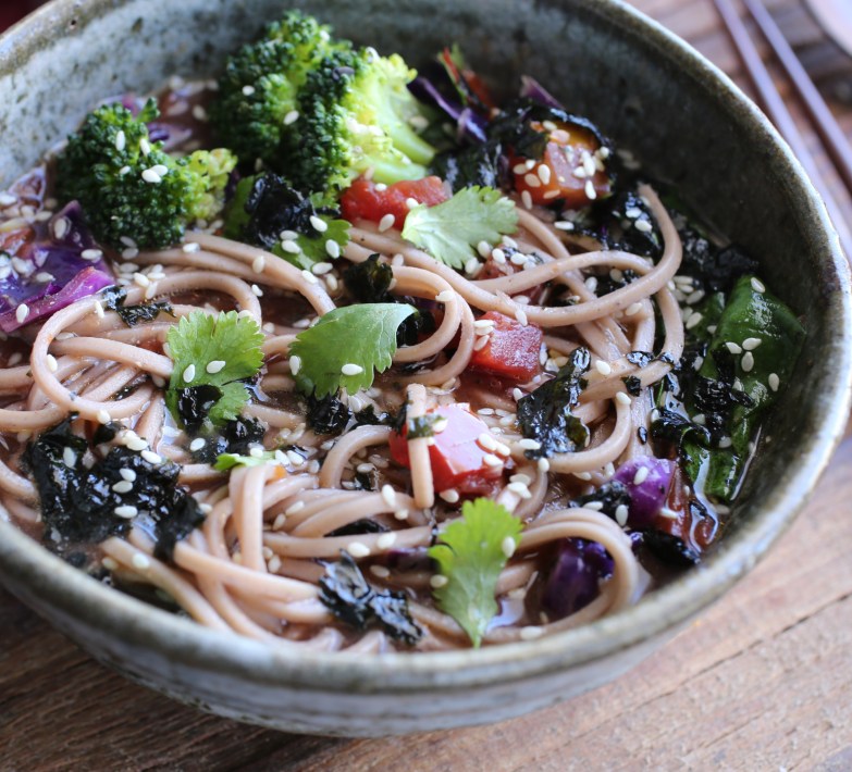 Soba Noodles with Tofu in Spicy Garlic Sauce and Avocado