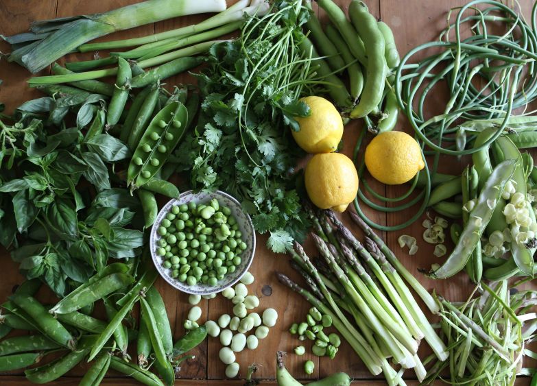 Quinoa-Polenta Cake with Fava Beans, Peas and Basil-Cilantro Purée